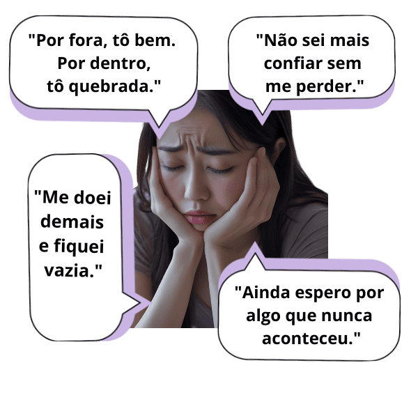 ❌ Você se cala, aceita migalhas e tenta parecer forte… mesmo quando está se quebrando por dentro. ➡️ Enquanto você não se escuta, vai continuar se perdendo para ser amada.