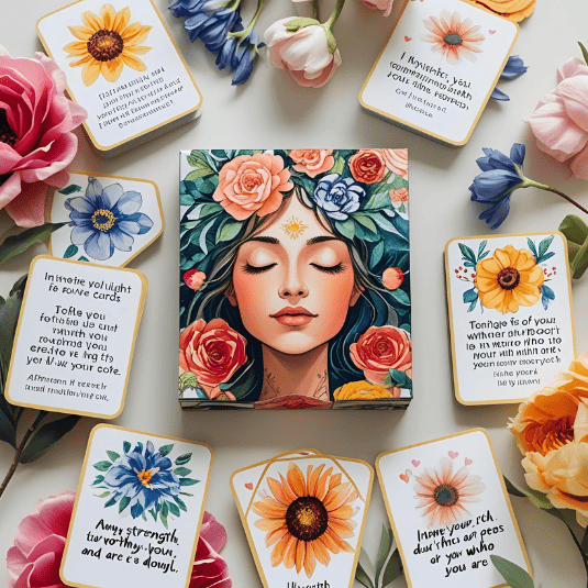 Cartas de cura com mensagens intuitivas de amor-próprio, força interior e merecimento.